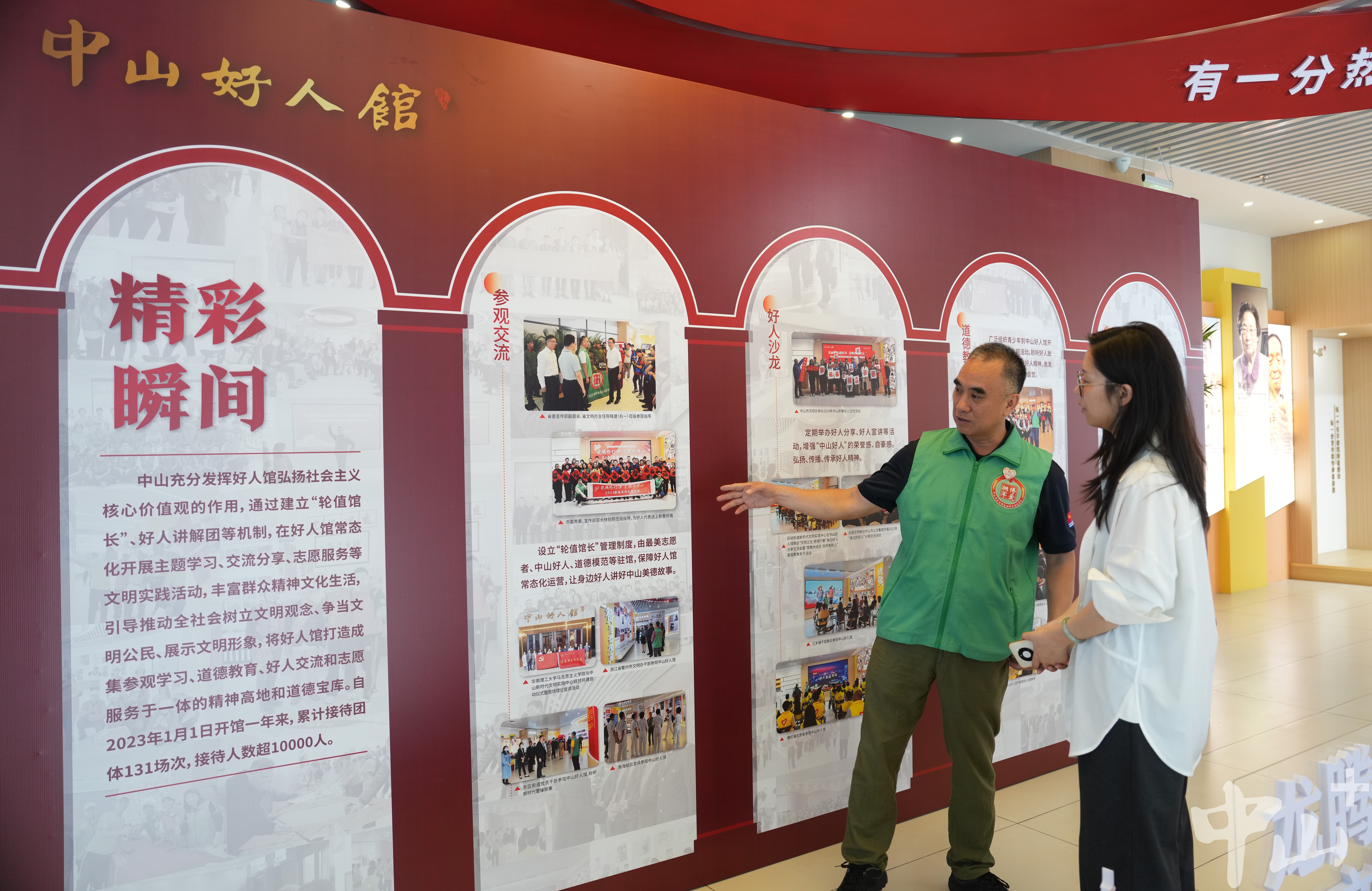 作為一名退伍軍人,李克有很多曾一起在戰(zhàn)場上出生入死的戰(zhàn)友,其中不乏已經(jīng)為國捐軀的烈士。自2007年起,他便自發(fā)組織尋找犧牲的中山籍戰(zhàn)友,先后6次帶隊前往廣西邊境的多個烈士陵園,成功尋到29名犧牲戰(zhàn)友信息,并將相關(guān)信息報送給中山市退役軍人事務(wù)局。 “我有一位戰(zhàn)友,寧愿把生的希望留給其他人,19歲不到就犧牲在戰(zhàn)場上。他們已經(jīng)離我們而去,更重要的是我們能為他們做些什么。所以逢年過節(jié)我都會看望他們的家人,把歡樂也帶給老人家?!崩羁苏f。 2016年,得知戰(zhàn)友的女兒患先天性心臟病,須進行心肺聯(lián)合移植手術(shù),李克立即帶頭捐款,并聯(lián)系政府相關(guān)部門和電視臺,通過媒體報道讓更多愛心人士關(guān)注到了這位困難老兵。在他的多方奔走下,社會各界紛紛伸出援助之手,募集醫(yī)藥費40余萬元,助戰(zhàn)友的女兒順利完成了手術(shù)。 牽頭成立志愿服務(wù)隊 延續(xù)志愿精神 作為一名有著30多年志愿服務(wù)經(jīng)歷的資深志愿者,李克的生活已經(jīng)與志愿分不開。他的身上始終有一抹綠色:在軍營,是守衛(wèi)國門的綠軍裝;在社區(qū),是服務(wù)群眾的綠馬甲。在人民群眾需要的地方,李克每次都沖在最前線。 “2020年疫情暴發(fā)時,很多人都響應(yīng)號召待在家里,我覺得作為一個打過仗的老兵,我總得站出來做點事?!睕]有過多考慮,李克第一時間加入到了志愿者隊伍中,并在社區(qū)堅守了整整60天。當(dāng)時防護物資匱乏,李克還自掏腰包托人在廣州購買了6萬元左右的防護物資,全部捐贈給了在一線抗疫的工作人員。 近年來,李克還積極捐資助學(xué)、支援災(zāi)區(qū)、扶危濟困,連續(xù)6年資助6名困難學(xué)生,為汕尾市陸河中學(xué)捐贈10套多媒體電腦設(shè)備,堅持參與無償獻血直到60歲。 2018年起,李克擔(dān)任文明城市巡查監(jiān)督員,奔走在街道各個路口、每條小巷,整理亂停亂放的共享單車,清理“牛皮癬”小廣告,保障街頭巷尾干凈衛(wèi)生。同一年,為更有組織地開展志愿活動,李克牽頭成立了一支以退役軍人為主導(dǎo)的東區(qū)博愛擁軍志愿服務(wù)隊,把戰(zhàn)友們凝聚在一起,共同為社會作貢獻。如今,這支志愿服務(wù)隊已從最初的8名成員,逐漸壯大至400多人,成為服務(wù)社會的一支生力軍。 講好好人故事,傳承紅色文化 4月19日上午,記者在“中山好人館”見到了正在擔(dān)任“輪值館長”的李克。從去年1月開始,他每個月都參與輪值,先后為140多場活動、1萬多名市民群眾義務(wù)講解博愛之城的凡人善舉、好人大愛。  正在中山好人館輪值的李克。記者 劉萬杰 攝