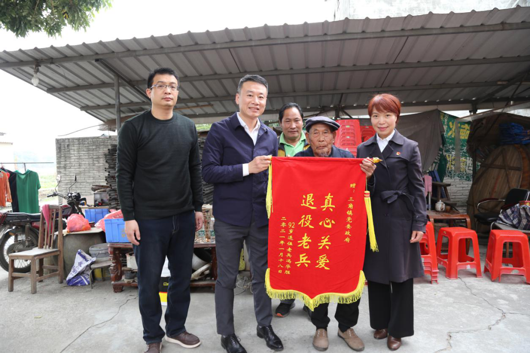 在馮伯家中,鎮(zhèn)領(lǐng)導(dǎo)一行與他閑話家常,關(guān)心其身體狀況、家人就業(yè)和生活情況,感謝其為國家做出的貢獻(xiàn)。