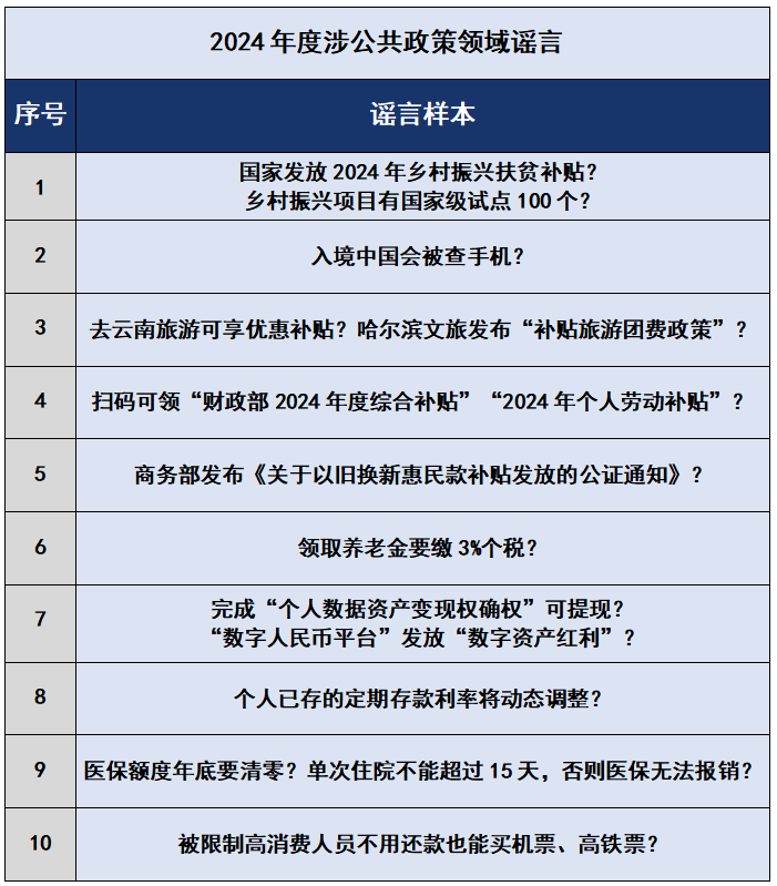 2024年3月,有不法分子冒用國(guó)家機(jī)關(guān)名義,假稱“國(guó)家發(fā)放2024年鄉(xiāng)村振興扶貧補(bǔ)貼”“鄉(xiāng)村振興項(xiàng)目有國(guó)家級(jí)試點(diǎn)100個(gè)”,以高額返利為誘餌,引誘大量不明真相的群眾加入所謂的各類“基金會(huì)”和“項(xiàng)目”,巧立名目騙取錢財(cái)。還有自媒體從公開(kāi)發(fā)布的政策信息中摘取碎片化信息,斷章取義,對(duì)政策歪曲解讀。如2024年10月,個(gè)別自媒體故意混淆“個(gè)人養(yǎng)老金”與“基本養(yǎng)老金”的概念,傳播“領(lǐng)取養(yǎng)老金要繳3%個(gè)稅”“養(yǎng)老金個(gè)稅起征點(diǎn)為5000元”等不實(shí)信息,引發(fā)公眾誤解。此外,在《國(guó)家安全機(jī)關(guān)行政執(zhí)法程序規(guī)定》和《國(guó)家安全機(jī)關(guān)辦理刑事案件程序規(guī)定》公布之際,一些別有用心之人借機(jī)造謠抹黑、搬弄是非,大肆炮制所謂“入境中國(guó)都會(huì)被查手機(jī)”的謠言,荒謬至極。