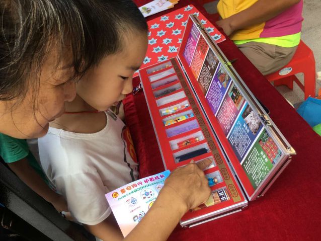 親子家庭在禁毒志愿者的引導(dǎo)下進(jìn)行禁毒小游戲。